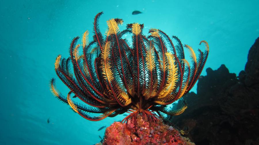 Crinoids are related to starfish and are animals and not plants as many people mistakenly believe. When one swims over and attaches itself to your wetsuit you are certain that it is not a plant that has latched on an is crawling on you. :)